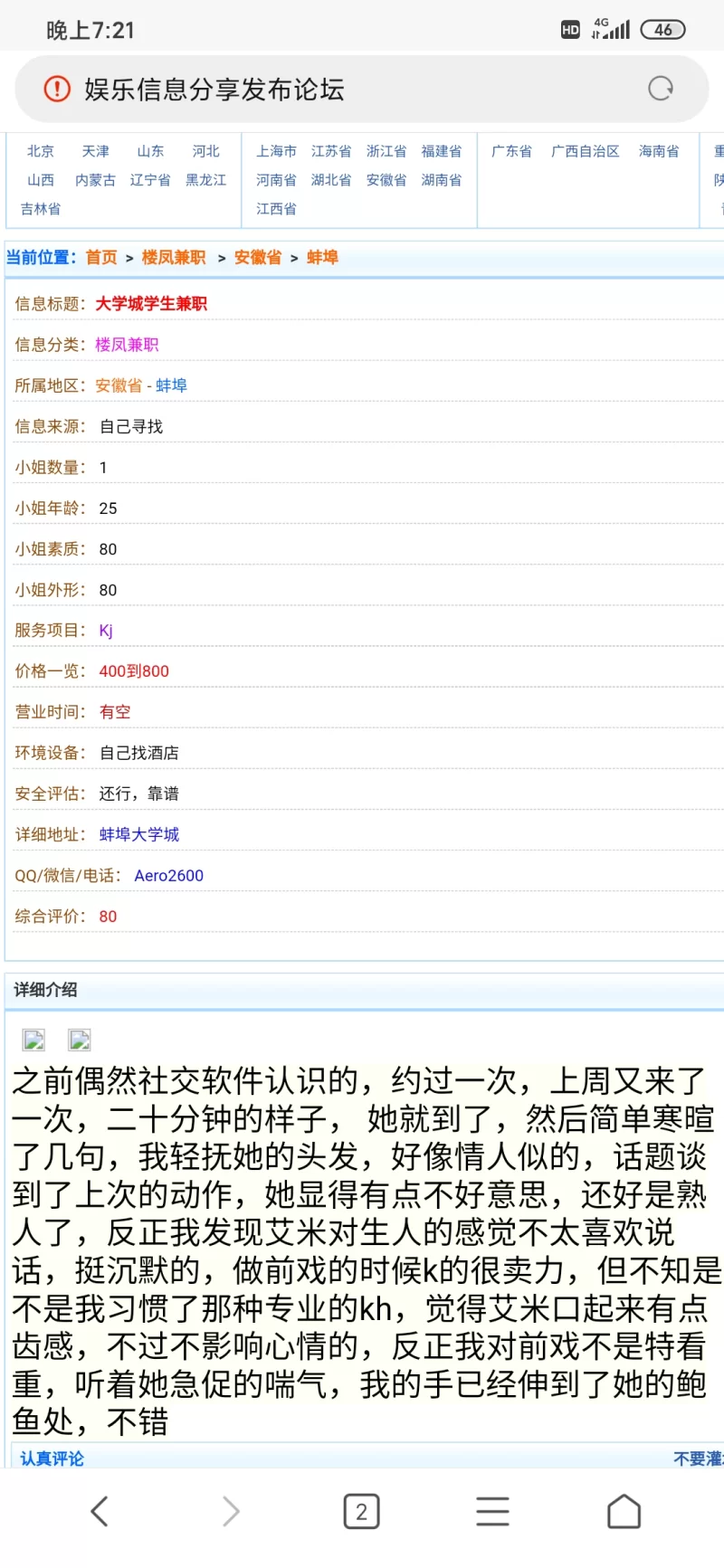 信息分类:黑店曝光 地区:安徽省-蚌埠 信息来源:1 小姐数量:1 小姐年龄:1 小姐素质:1 小姐外形:1 服务项目:1 价格:1 营业时间:1 环境设备:1 安全评估:1 详细地址: (管理提示:经用户举报,此信息有诈骗行为,请勿被骗!) 联系方式: (管理提示:经用户举报,此信息有诈骗行为,请勿被骗!) 综合评价:1 详细介绍: 我无语了,蚌埠有真的吗,兄弟们推荐推荐 骗子曝光