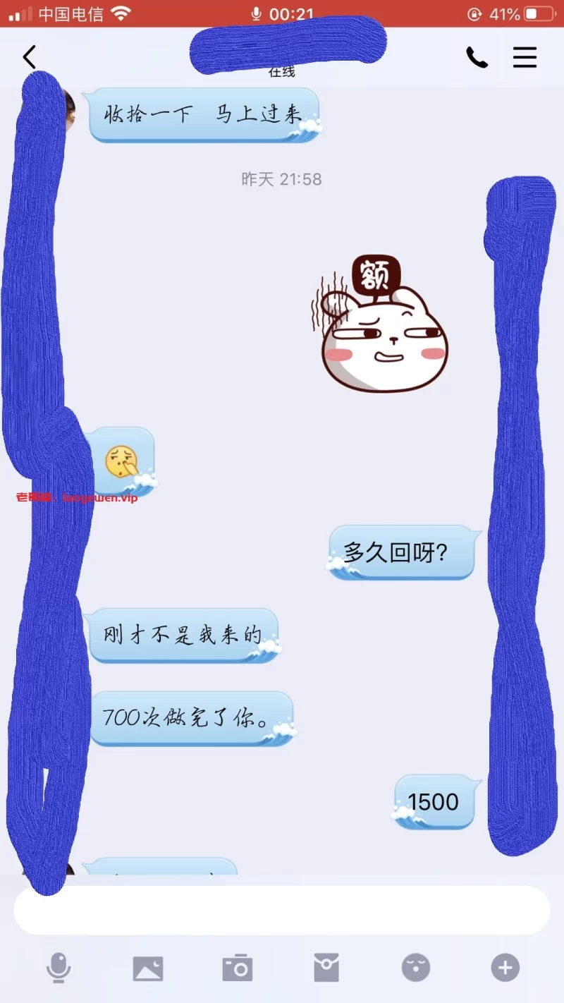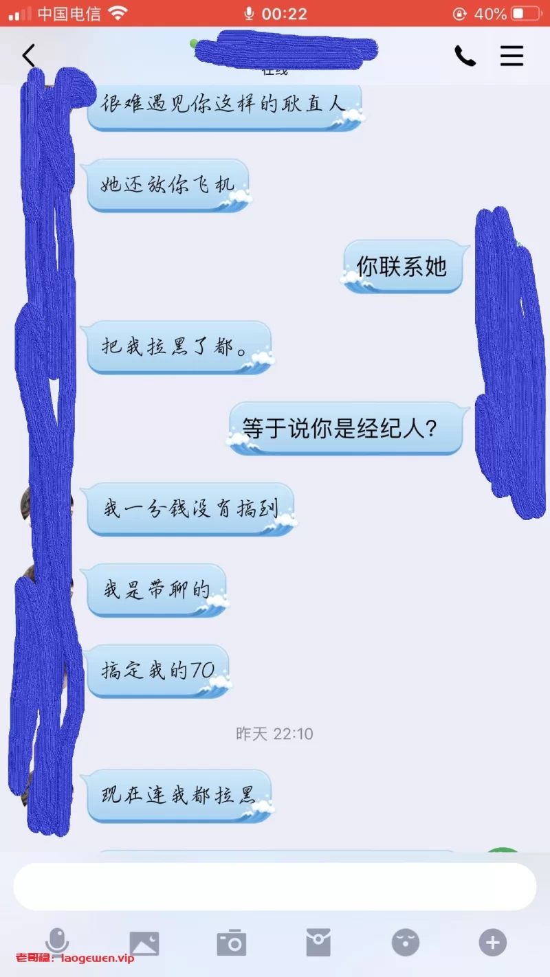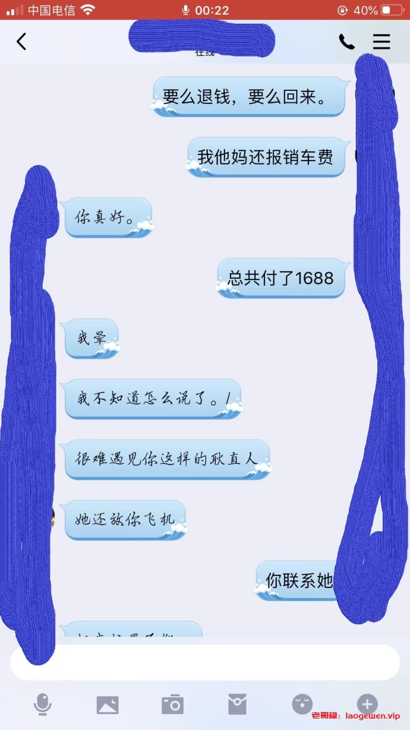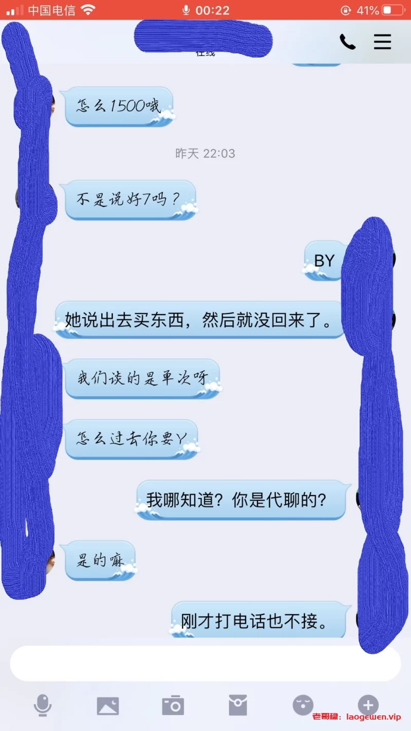 注意注意注意,温州的,号码是甘肃兰州的,189开头,尾号4587.贼没职业素质。谈好BY1500,还找我要车费,我从来不小气。直接打了1688.结果就泄了个火,其它什么服务都没有。直接躺床上澡都不洗。然后称我洗澡的功夫直接跑了。温州的各位狼友请注意这个骗子,别再上当。